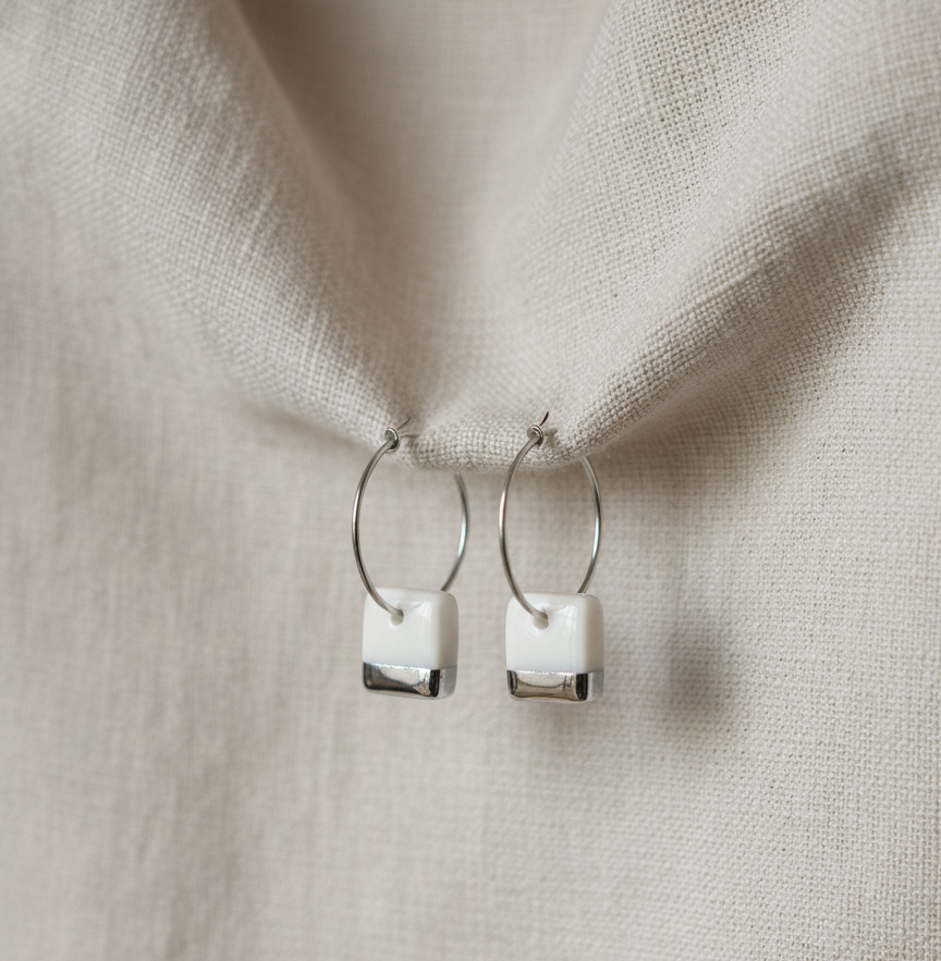 Los Pendientes Ásimi Blanquerna combinan la pureza de la porcelana con una línea dorada que los dota de sencillez para el día a día. Cada pendiente se crea manualmente, se cuece, se esmalta y recibe un baño de esmalte transparente que le da un acabado final delicado.