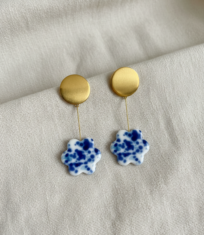 Los Pendientes Astrid combinan la pureza de la porcelana con un detalle azul que resalta volumen y textura. Cada pendiente se realiza manualmente, se cuece, se esmalta y recibe un acabado brillante.