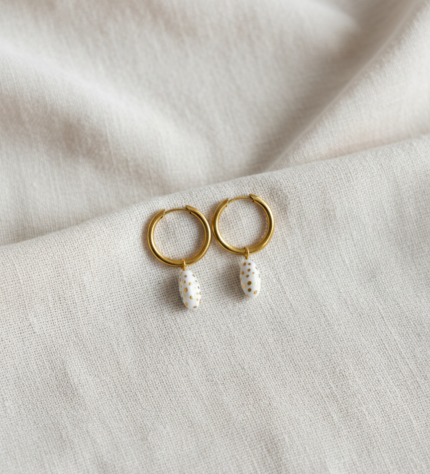 Los Pendientes Desirée combinan la pureza de la porcelana con unos puntitos de oro líquido que los dota de sencillez para el día a día. Cada pendiente se crea manualmente, se cuece y recibe un baño de esmalte transparente que le da un acabado final delicado.