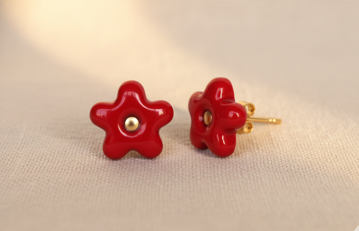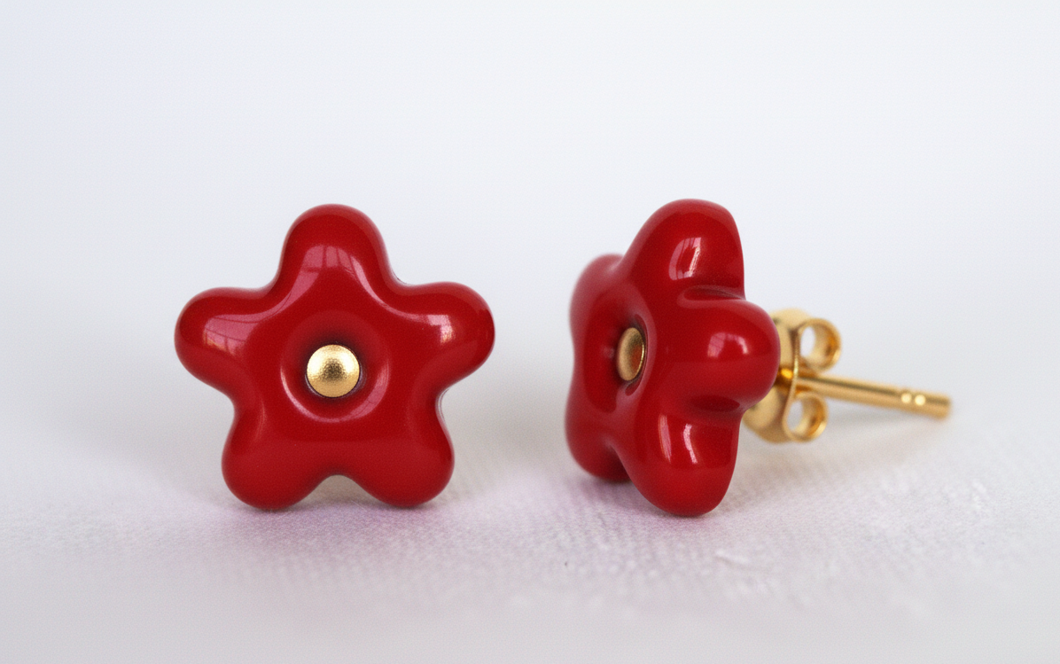 Intensos y con mucha presencia, los Pendientes Flor Red destacan por su esmalte rojo vivo que resalta la forma orgánica del pétalo. Al cocer, el rojo puede mostrar zonas más oscuras en bordes, algo típico de la cerámica artesanal y muy apreciado por coleccionistas.